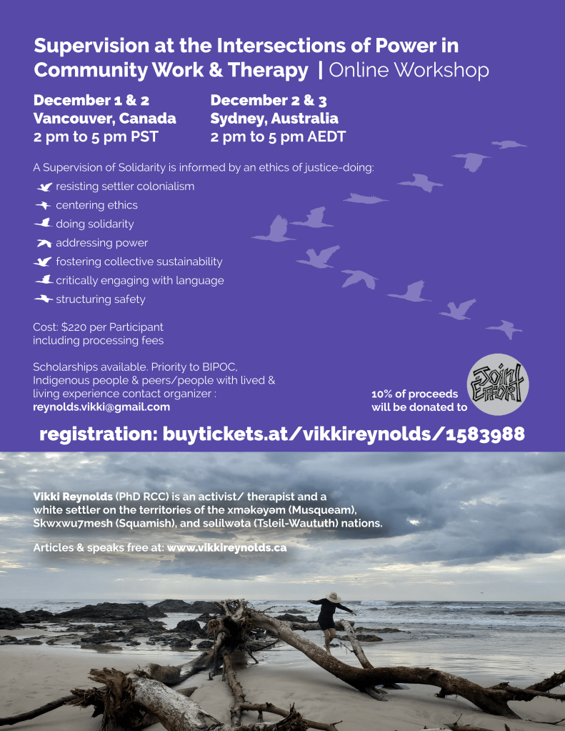 Vikki will lay some groundwork for understanding responses to loss and hardship in our work from a place that holds the dignity and respect for workers and our participants. This will require we look at the social structures of oppression and structural violence that make up the landscape of our work, and we’ll consider collective and individual responses to loss that can give a foot up on being harmed and disconnected in the work and honour our humanity and our pretty fabulous ways of “showing up and doing the hard things.”
