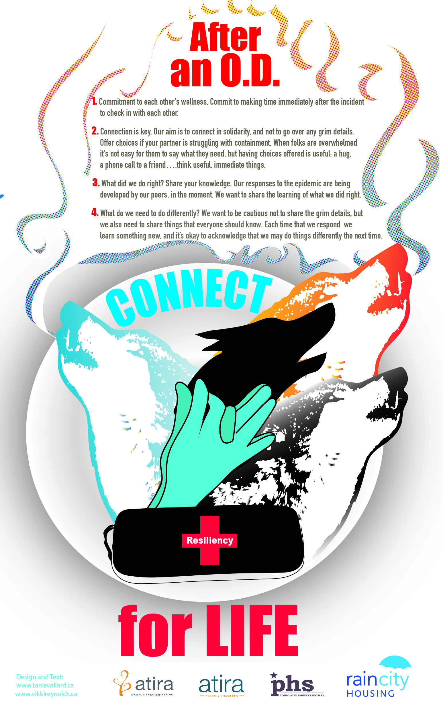 Debriefing that is centered on traumatic details, happens too late, and has no structure for safety or usefulness can be retraumatizing to workers and lead to venting and despair. We’re looking to debrief in ways that honour connection, center our collective care, and are an enactment of our commitments to each other as co-workers. We begin by committing to connecting immediately following a traumatic event, co-regulating each other, and staying with connection to prevent further traumatizing each other. We know that the research for responding to the opioid epidemic/poisonings comes from the ‘first-first responders,’ and so our debriefing method needs to address these new learnings as well as incorporate a thorough critique of what needs to be different.